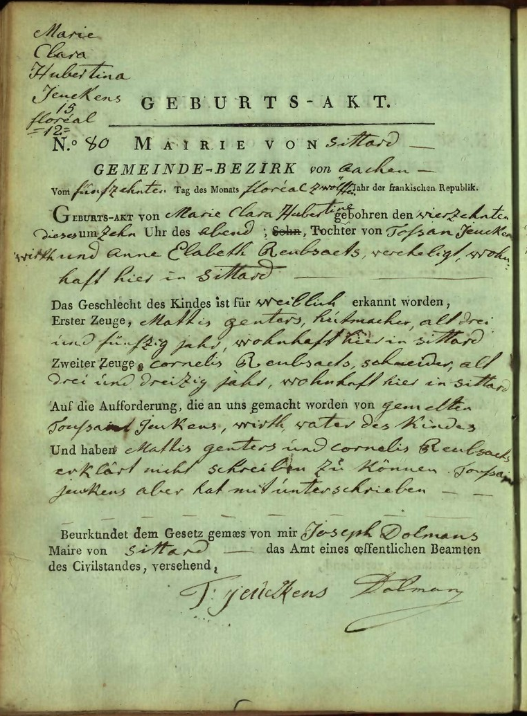 Geboorteakte van Marie Clara Hubertine Jeuckens van 4 mei 1804