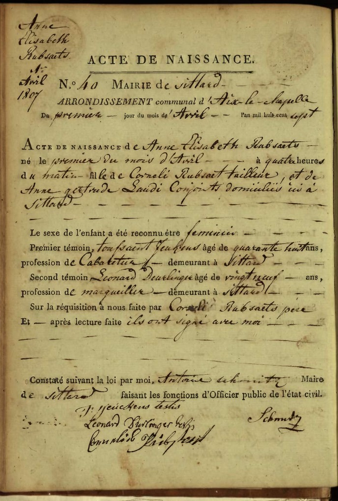 Geboorteakte van Anne Elisabeth Rubsaets van 1 april 1807