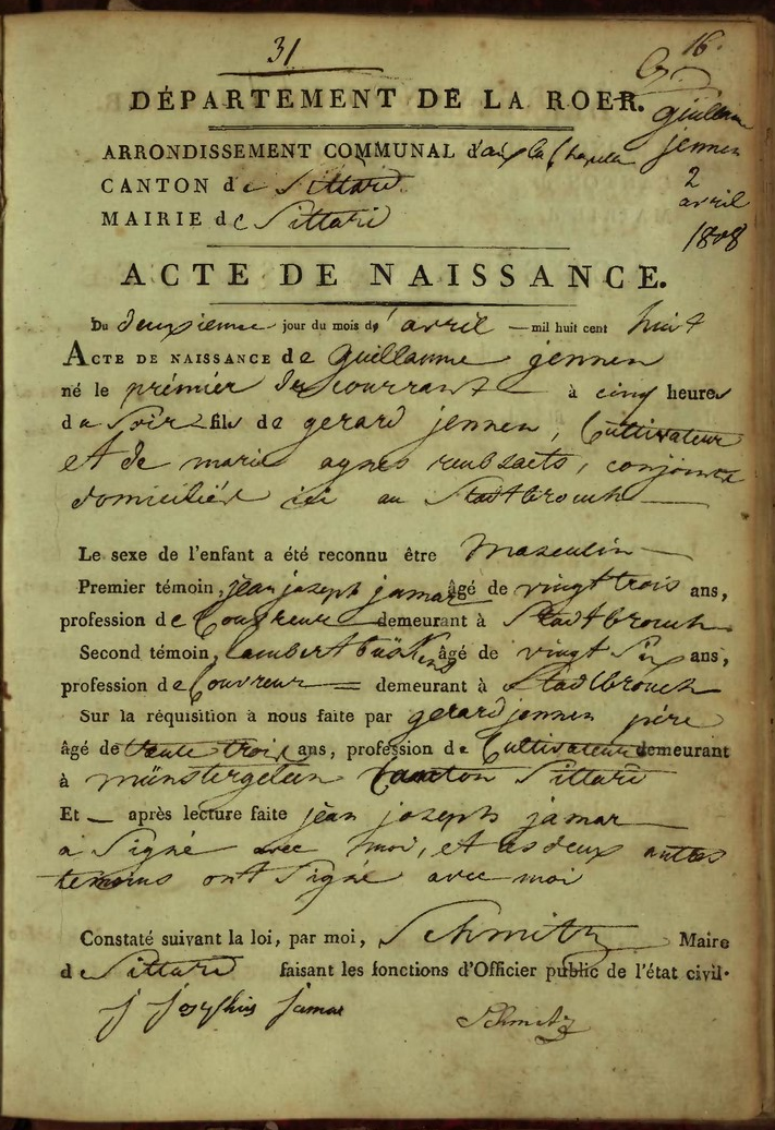 Geboorteakte van Willem Jennen van 1 april 1808