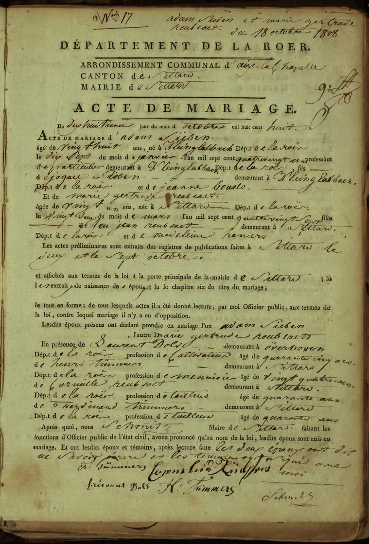 Huwelijksakte van Adam Sieben en Marie Gertrude Reubsaet van 18 oktober 1808