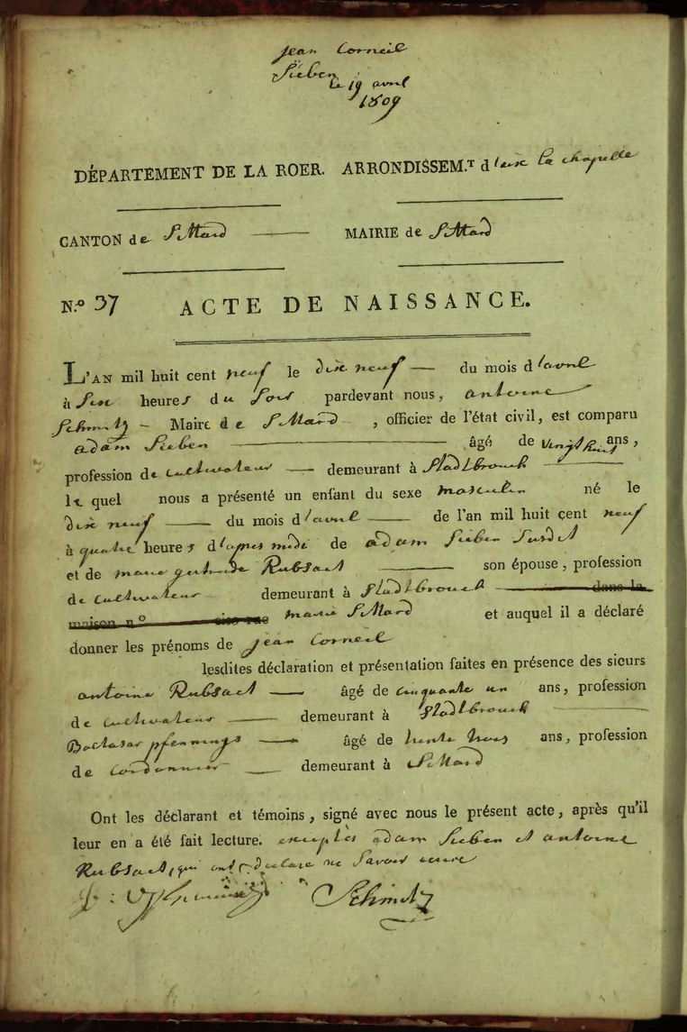 Geboorteakte van Jean Corneille Sieben van 19 april 1809