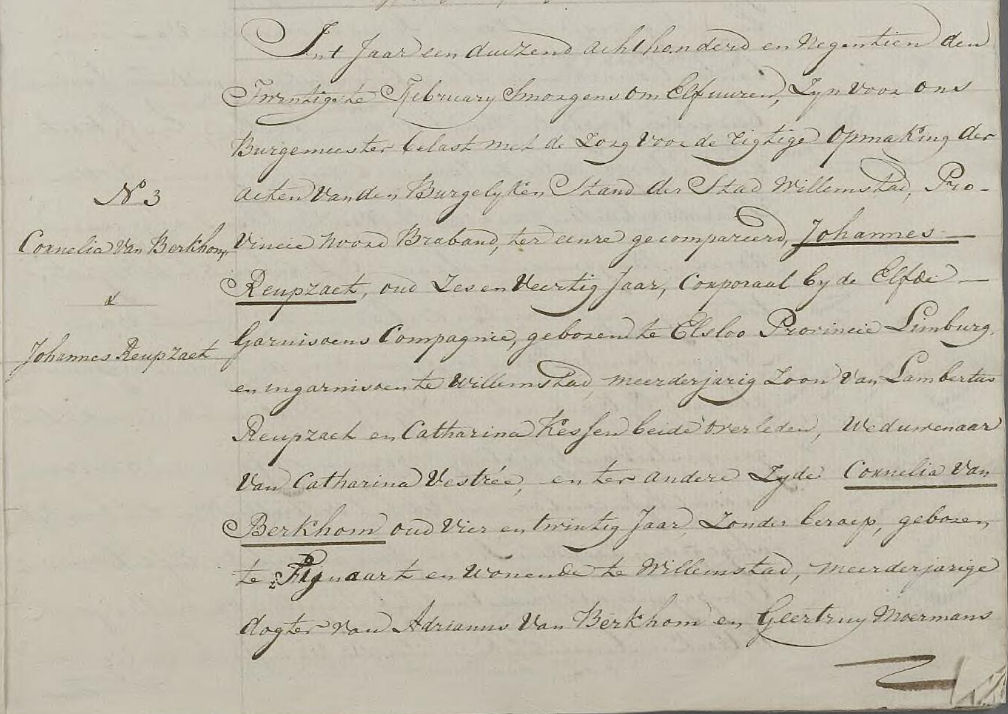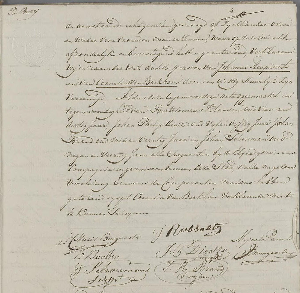 Huwelijksakte van Joannes Reubsaet en Cornelia van Berkhom.