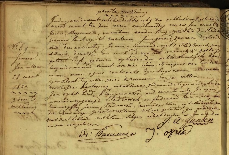 Geboorte akte van Jan Willem Jennen van 28 maart 1820