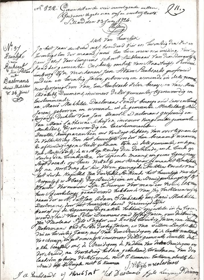 Huwelijksakte van Jan Adam Reubsaets en Marie Mechtilde Daelmans op 26 juni 1824.