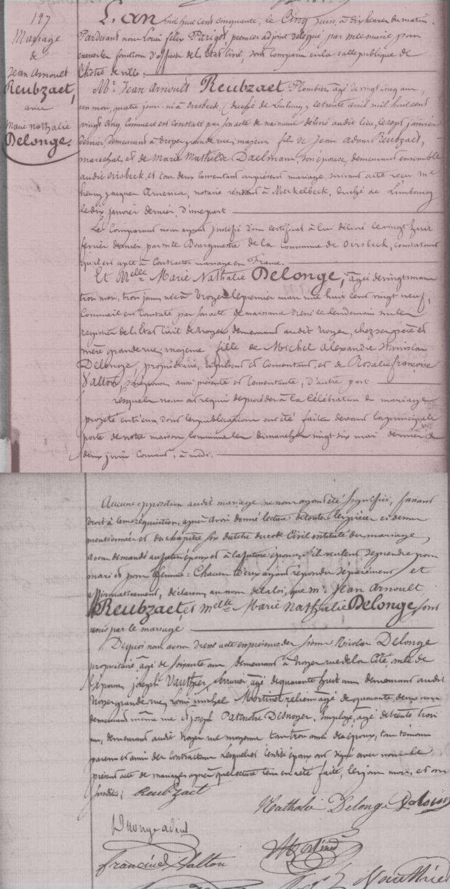 Huwelijksakte uit Troyes Frankrijk van Jan Arnold Reubsaet met Marie Nathalie Delonge van 5 juni 1850