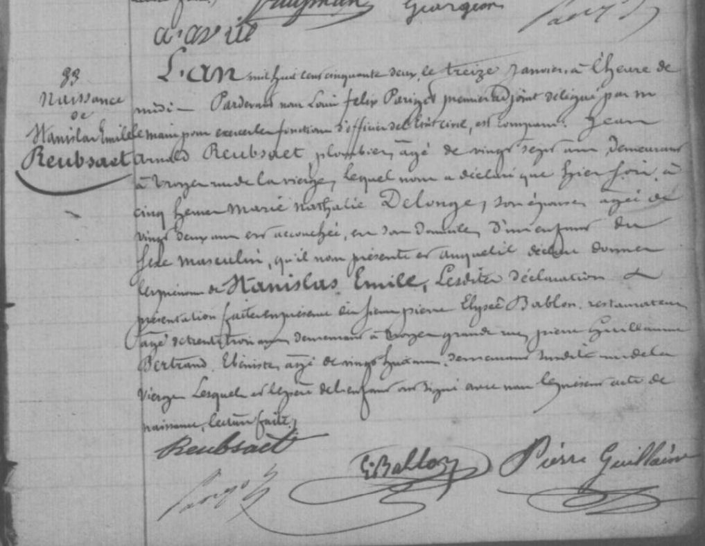 Geboorteakte van Stanislas Emile Reubsaet uit 1852