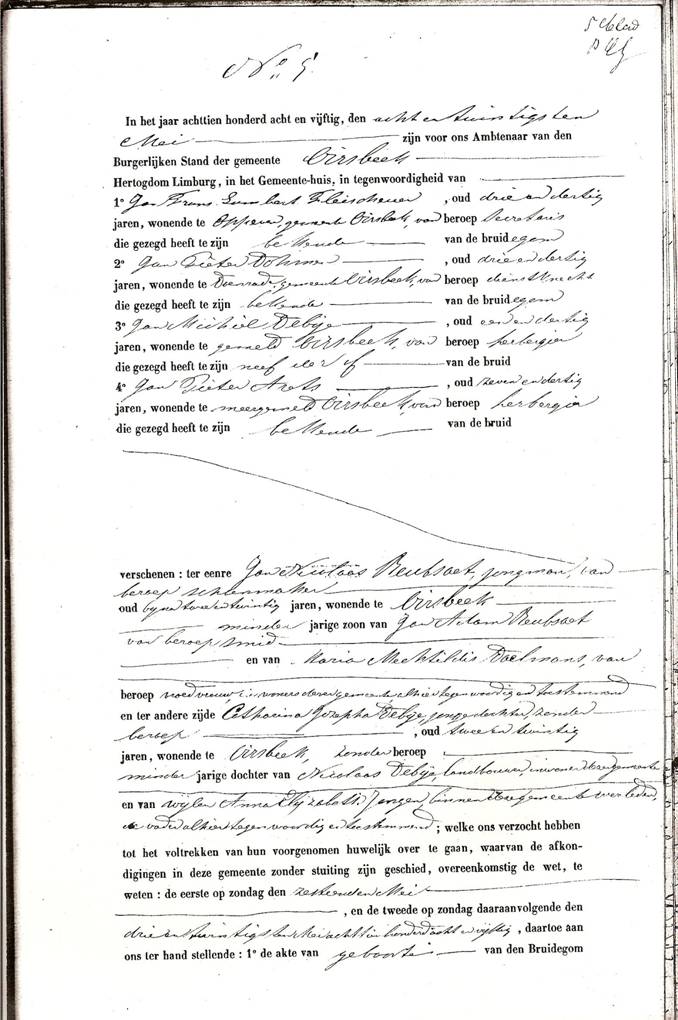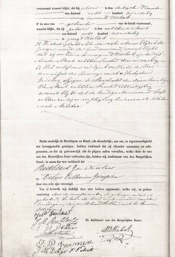 Huwelijksakte van Jan Nicolaas Reubsaet en Catharina Josepha Debije op 28 mei 1858