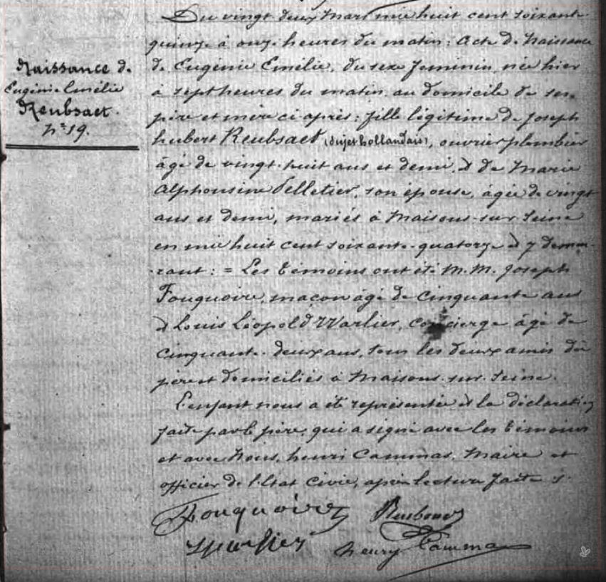 Geboorteakte van Eugénie Emilie Reubsaet van 20 maart 1865