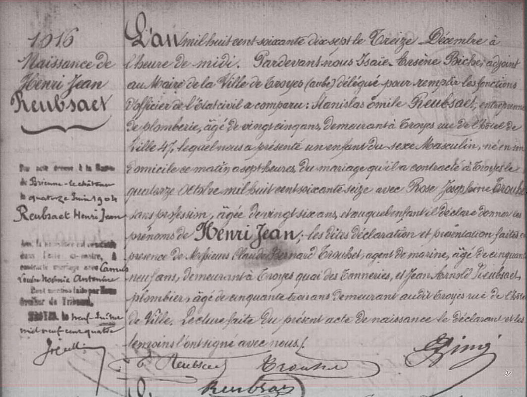 Geboorteakte uit Troyes Fr. van Henri Jean Reubsaet van 13 december 1877