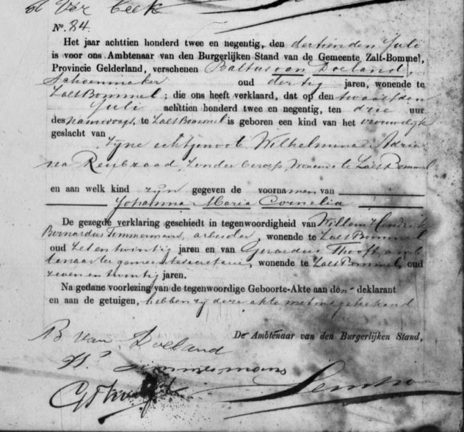 Geboorteakte van Johanna Maria Cornelia van Doeland van 12 juli 1892