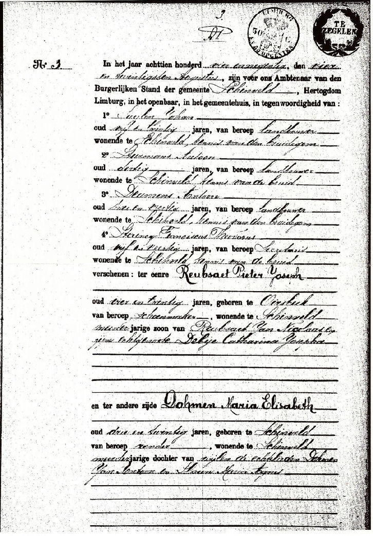 Huwelijksakte van Pieter Josef Reubsaet en Maria Elisabeth Dohmen op 24 augustus 1894