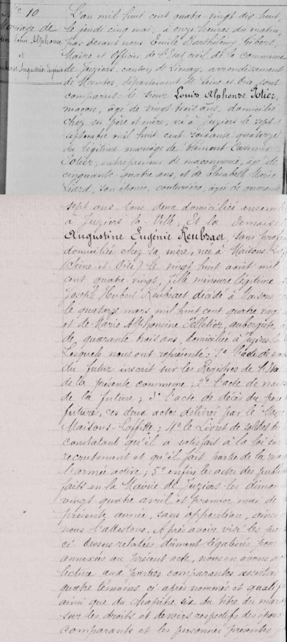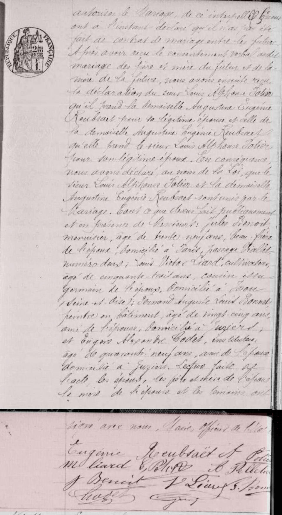 Huwelijksakte van Augustine Eugénie Reubsaet met Louis Alphonse Potier