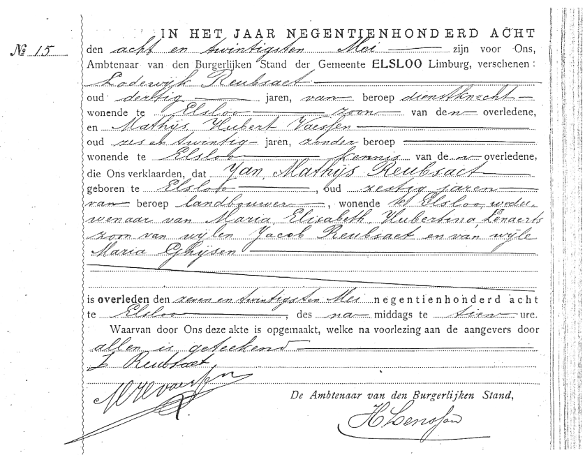 Akte van overlijden van Jan Mathijs Reubsaet op 27 mei 1908