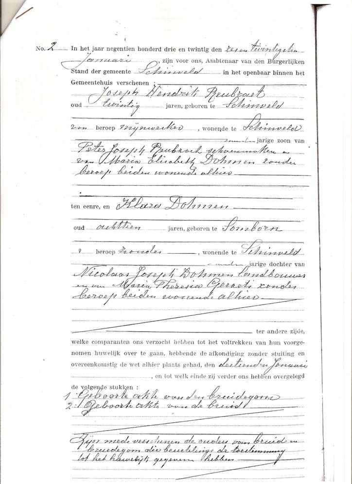 Huwelijksakte van Hendrik Joseph Reubsaet en Clara Dohmen op 26 januari 1923