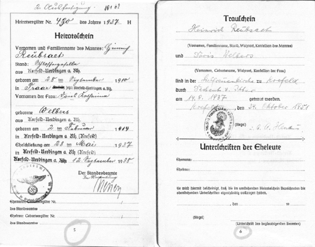 Twee pagina's uit het trouwboekje van Heinrich Reubsaet en Doris Katharina Welbers