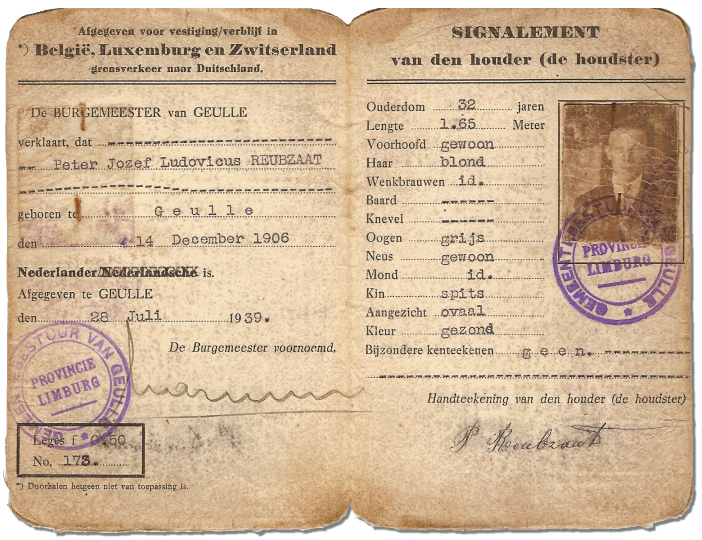 Reisdocument van Peter Josef Lodovicus Reubzaat van 28 juli 1939