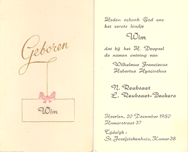 Doopkaartje van Wilhelmus Franciscus Hubertus Hyacinthus Reubsaet op 20 december 1950