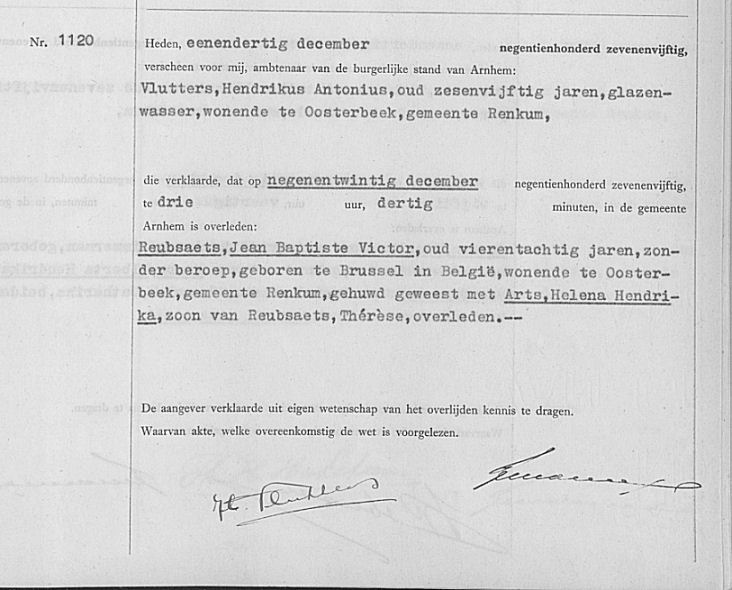 Overlijdensakte van Jean Baptiste Victor Reubsaets