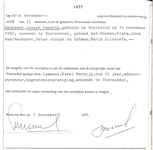 overlijdensakte van Joseph Hendrik Reubsaet op 3 december 1977