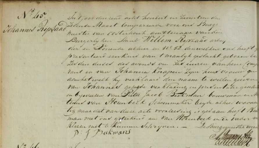 Geboorteakte van Johannes Ripzaad van 6 maart 1817 uit Oosterhout