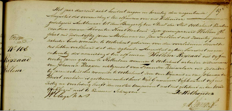 Overlijdensakte van Willem Ripzaad van 18 augustus 1829 uit Oosterhout,