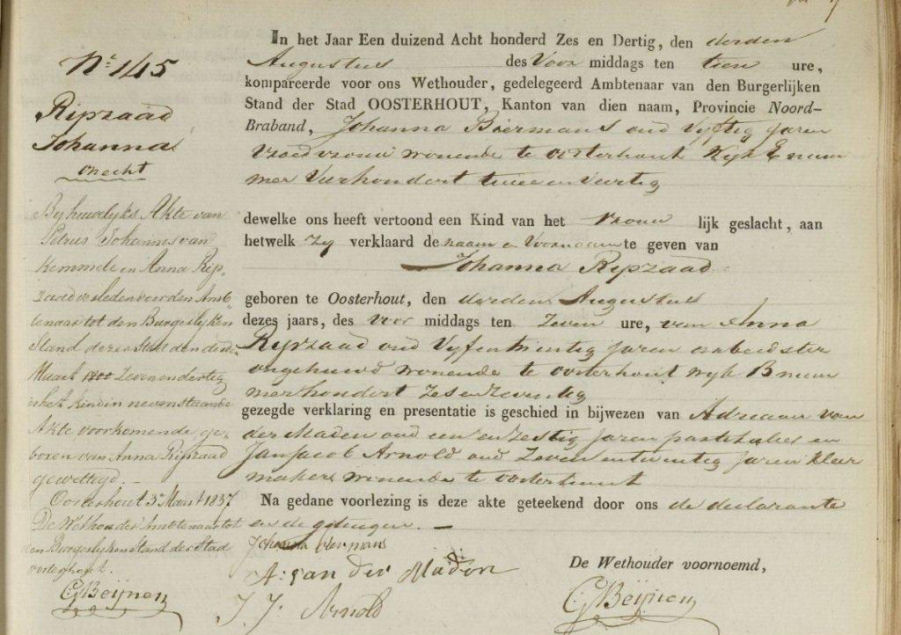 Geboorteakte van Johanna Ripzaad (van Kemmel) van 3 augustus 1836 uit Oosterhout,