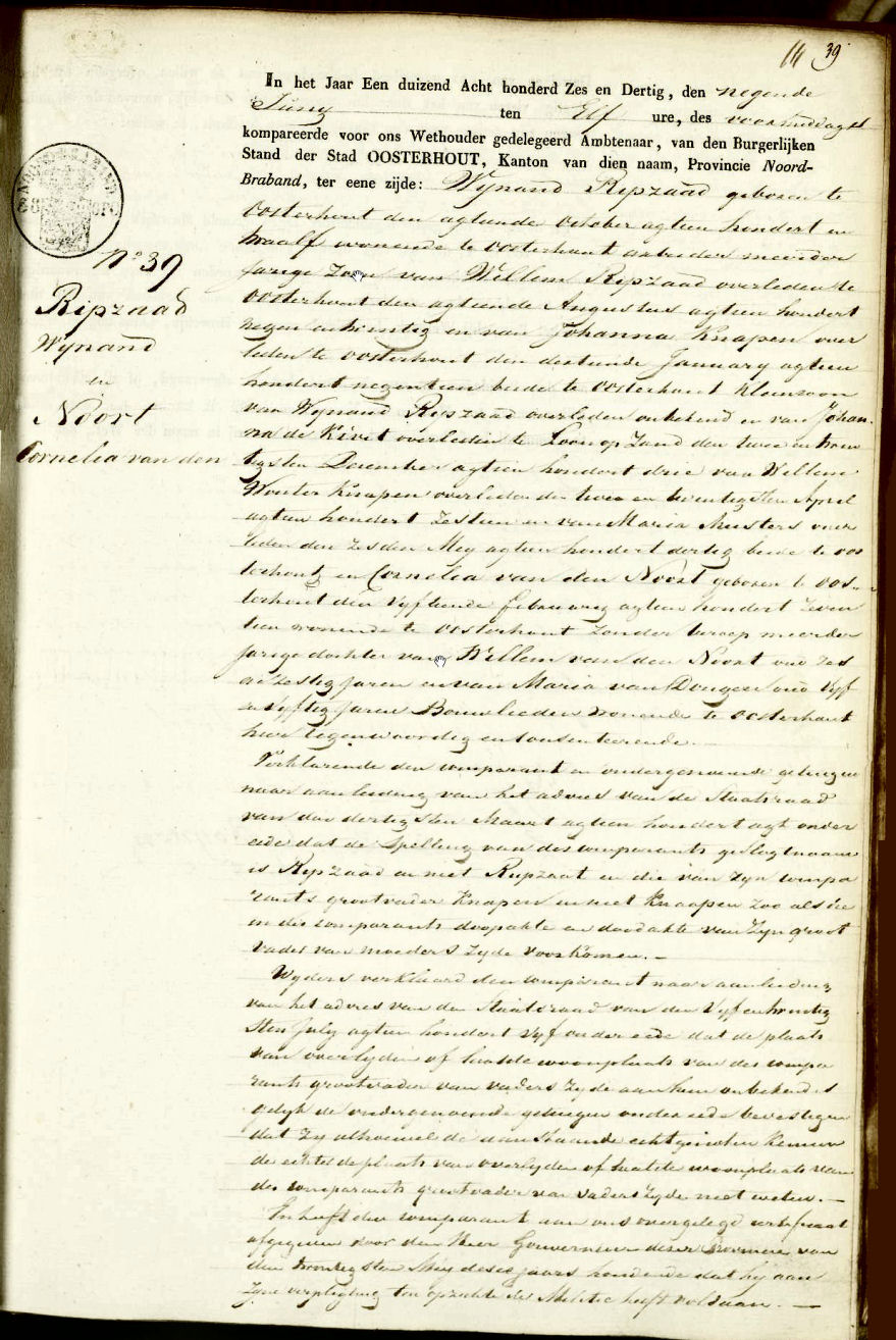 Huwelijksakte van Wijnand Ripzaad en Cornelia van den Noort van 9 juni 1836 uit Oosterhout,
