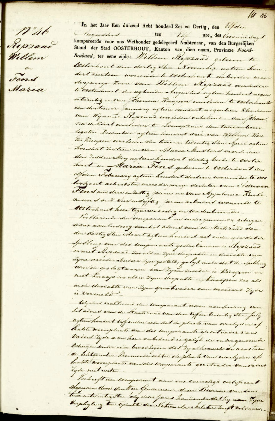 Huwelijksakte van Willem Ripzaad en Maria Fens van 11 augustus 1836 uit Oosterhout