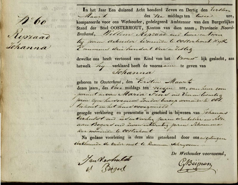 Geboorteakte van Johanna Ripzaad van 1 maart 1837 uit Oosterhout