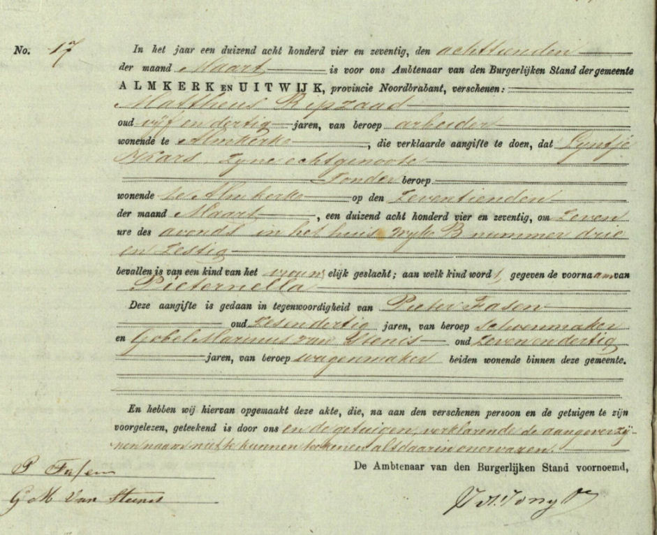 Geboorteakte van Pieternella Ripzaad van 18 maart 1864 uit Almkerk en Uitwijk