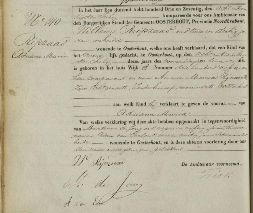 Geboorteakte van Adriana Maria Ripzaad van 28 juli 1873 uit Oosterhout
