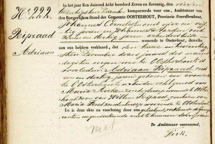 Overlijdensakteakte van Adriaan Ripzaad van 22 december 1877 uit Oosterhout