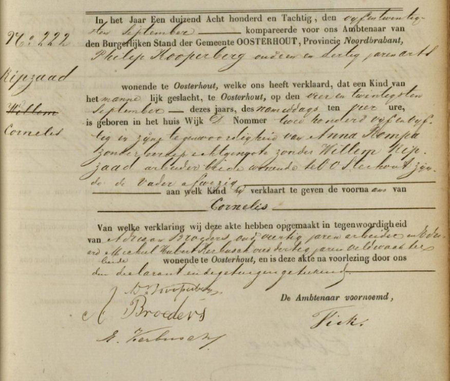 Geboorteakte van Cornelis Ripzaad van 24 september 1880 uit Oosterhout