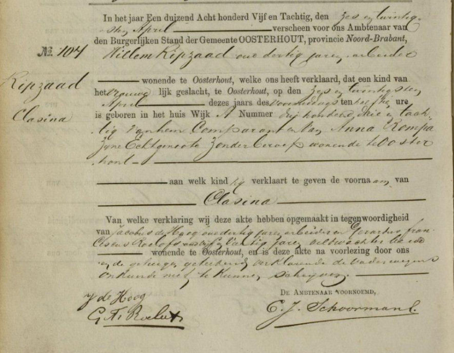 Geboorteakte van Clasina Ripzaad van 26 april 1885 uit Oosterhout