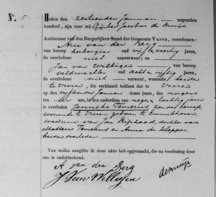 Overlijdensakte van Jenneke Tamerus van 16 januari 1900 uit Vuren