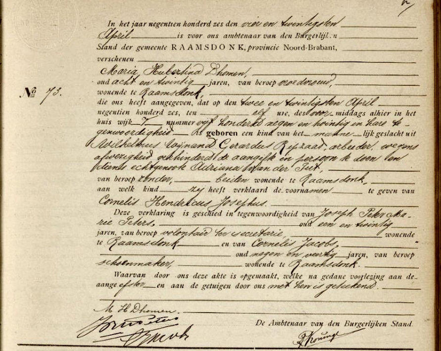 Geboorteakte van Cornelis Hendricus Josephus Ripzaad van 22 april 1906 uit Raamsdonk
