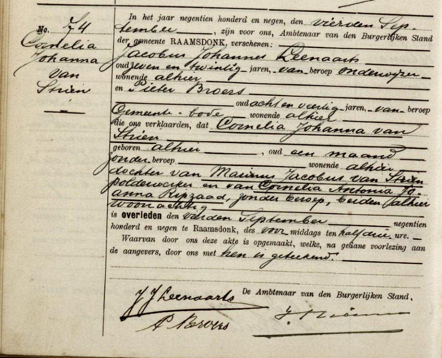 Overlijdensakte van Cornelia Johanna van Strien van 4 september 1909 uit Raamsdonk