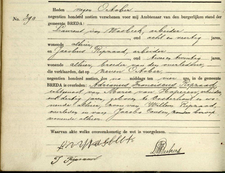 Overlijdensakte van Adrianus Franciscus Ripzaad van 7 oktober 1916 uit Breda