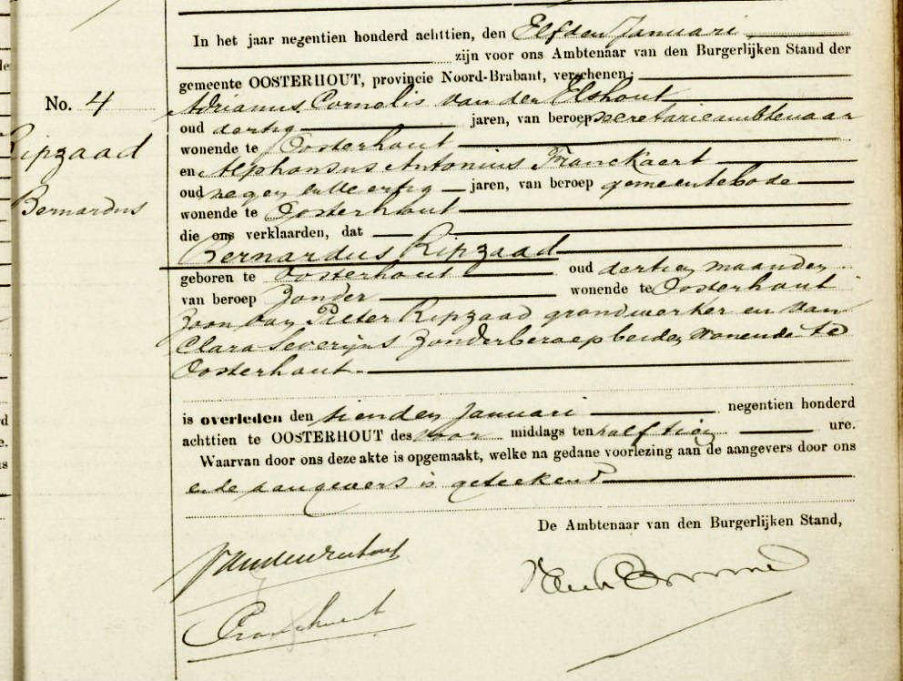 Overlijdensakte van Bernardus Ripzaad van 10 januari 1918 uit Oosterhout