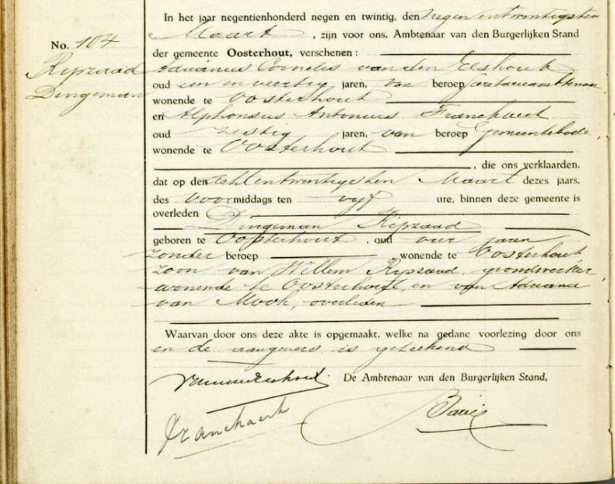 Overlijdensakte van Dingeman Ripzaad van 28 maart 1929 uit Oosterhout