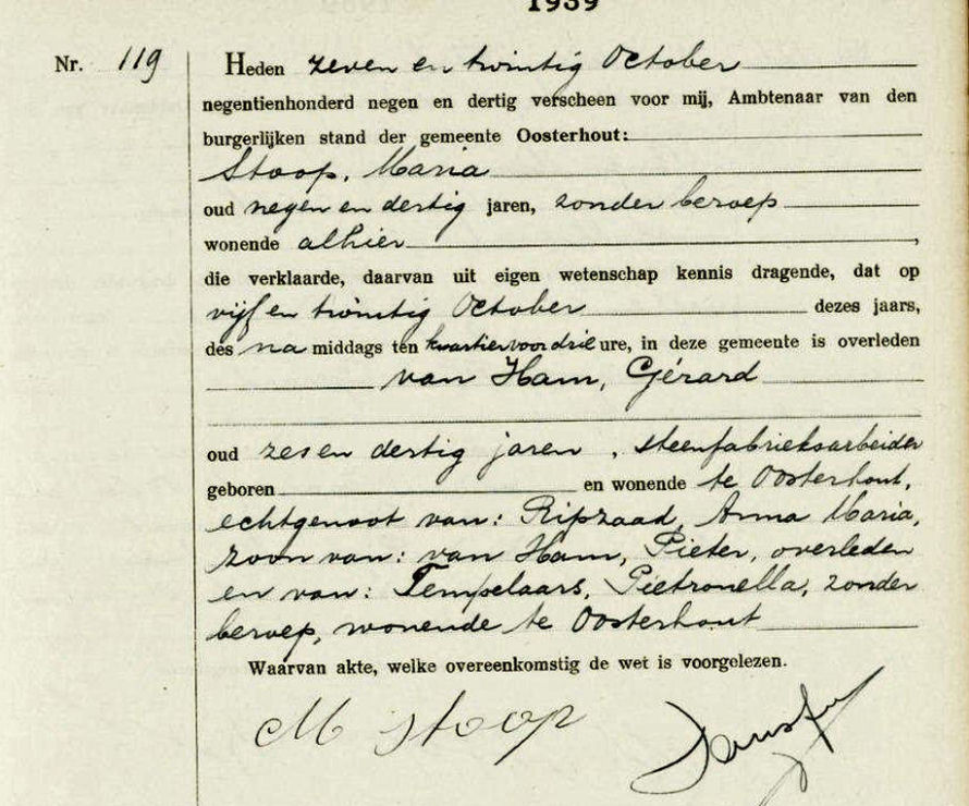Overlijdensakte van Gerard van Ham van 25 oktober 1939 uit Oosterhout