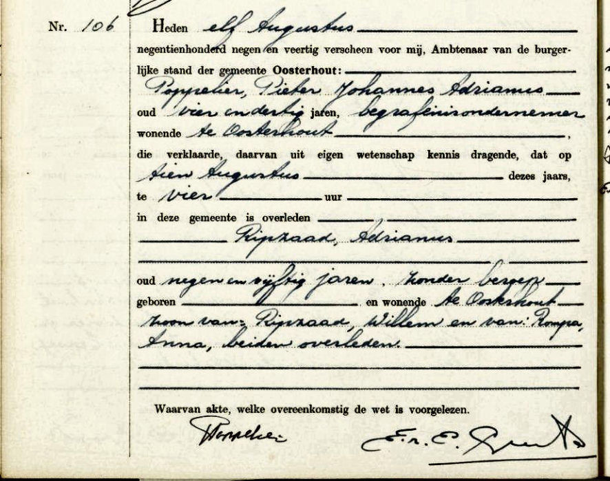 Overlijdensakte van Adrianus Ripzaad van 10 augustus 1949 uit Oosterhout